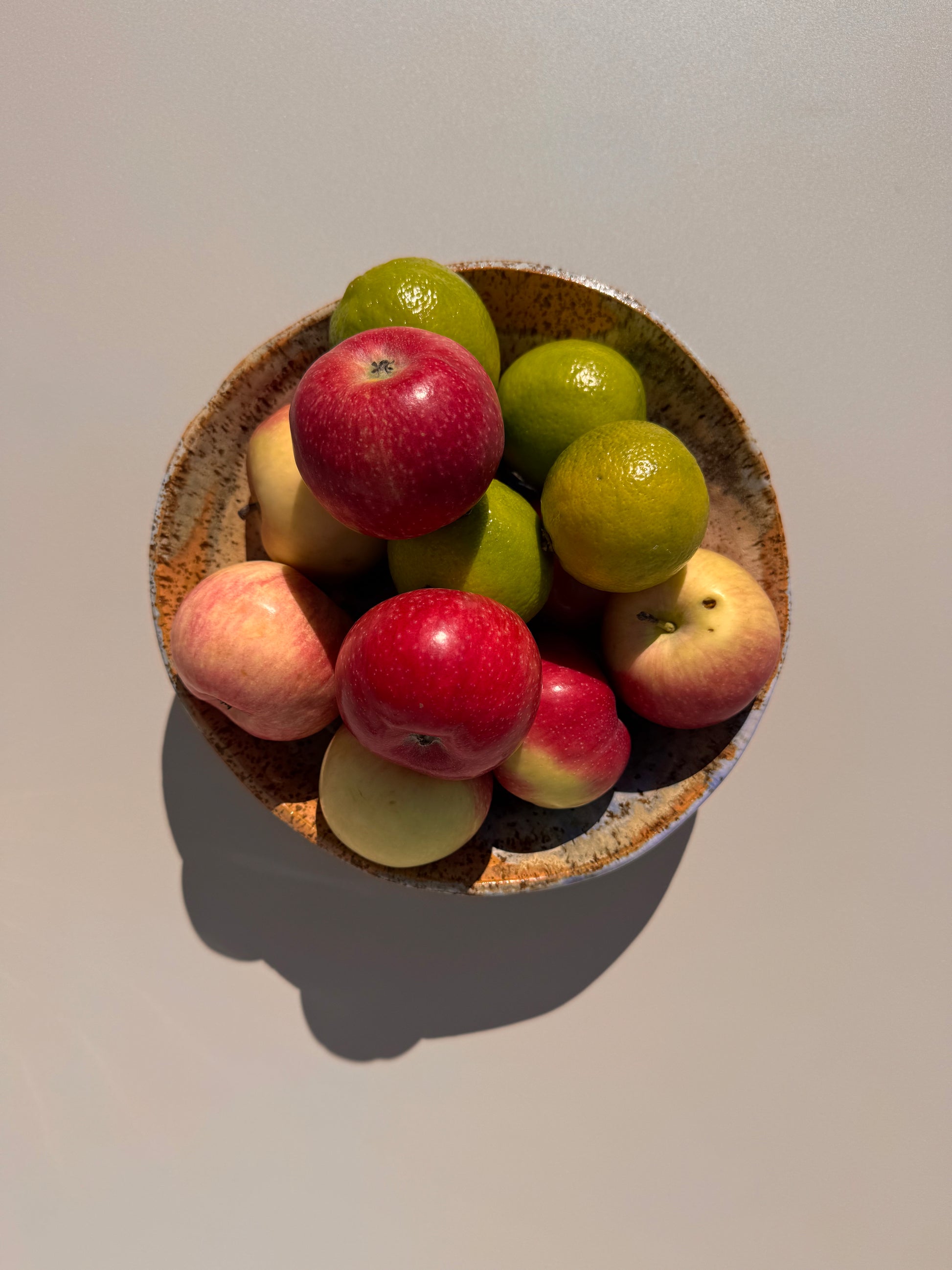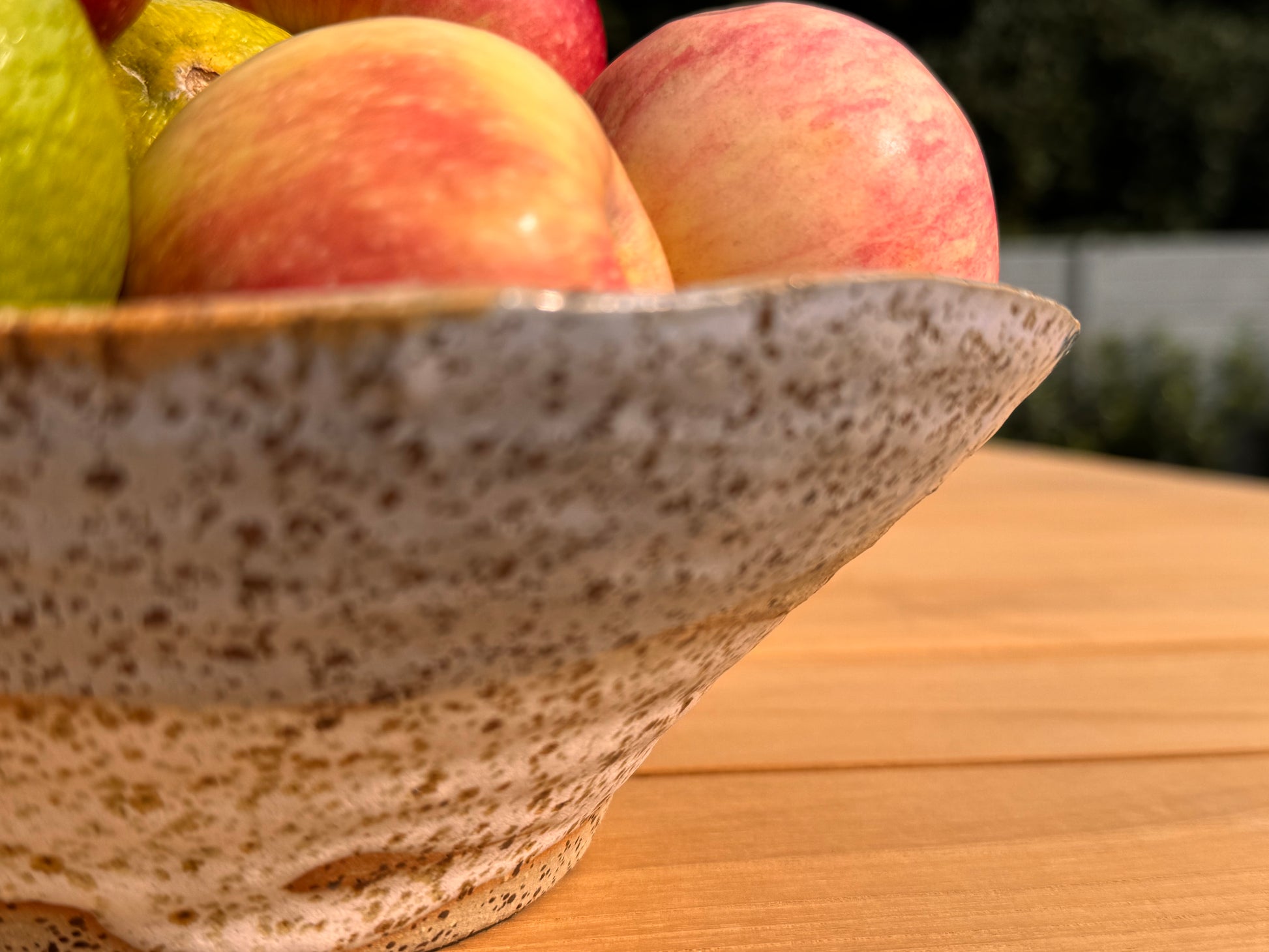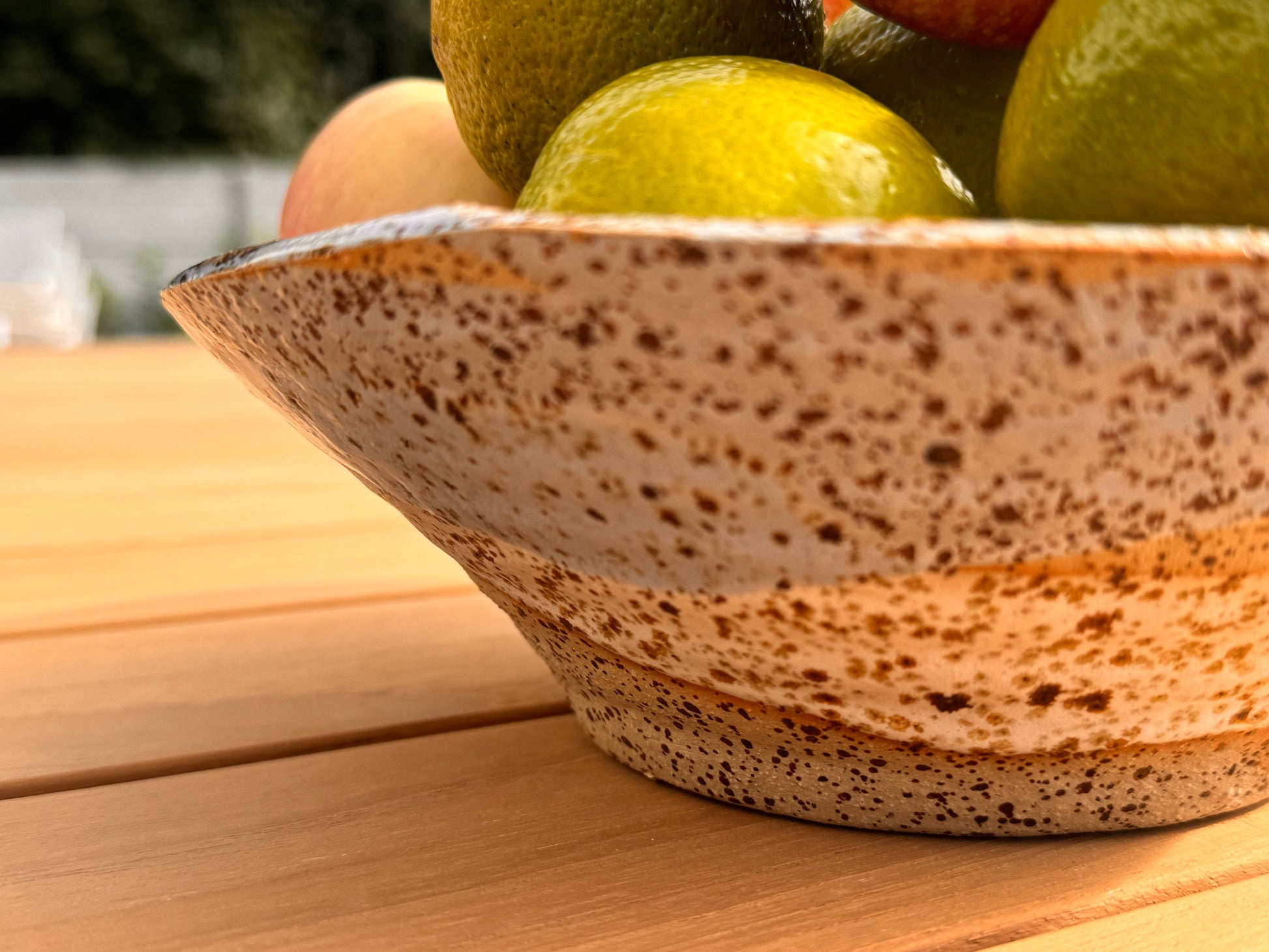 Ręcznie wykonana, ceramiczna misa, która swe piegi zawdzięcza nakrapianej glinie. Połączenia kolorystyczne, to wynik spontanicznego polewania różnych rodzajów szkliwa, co dało efekt WOW.