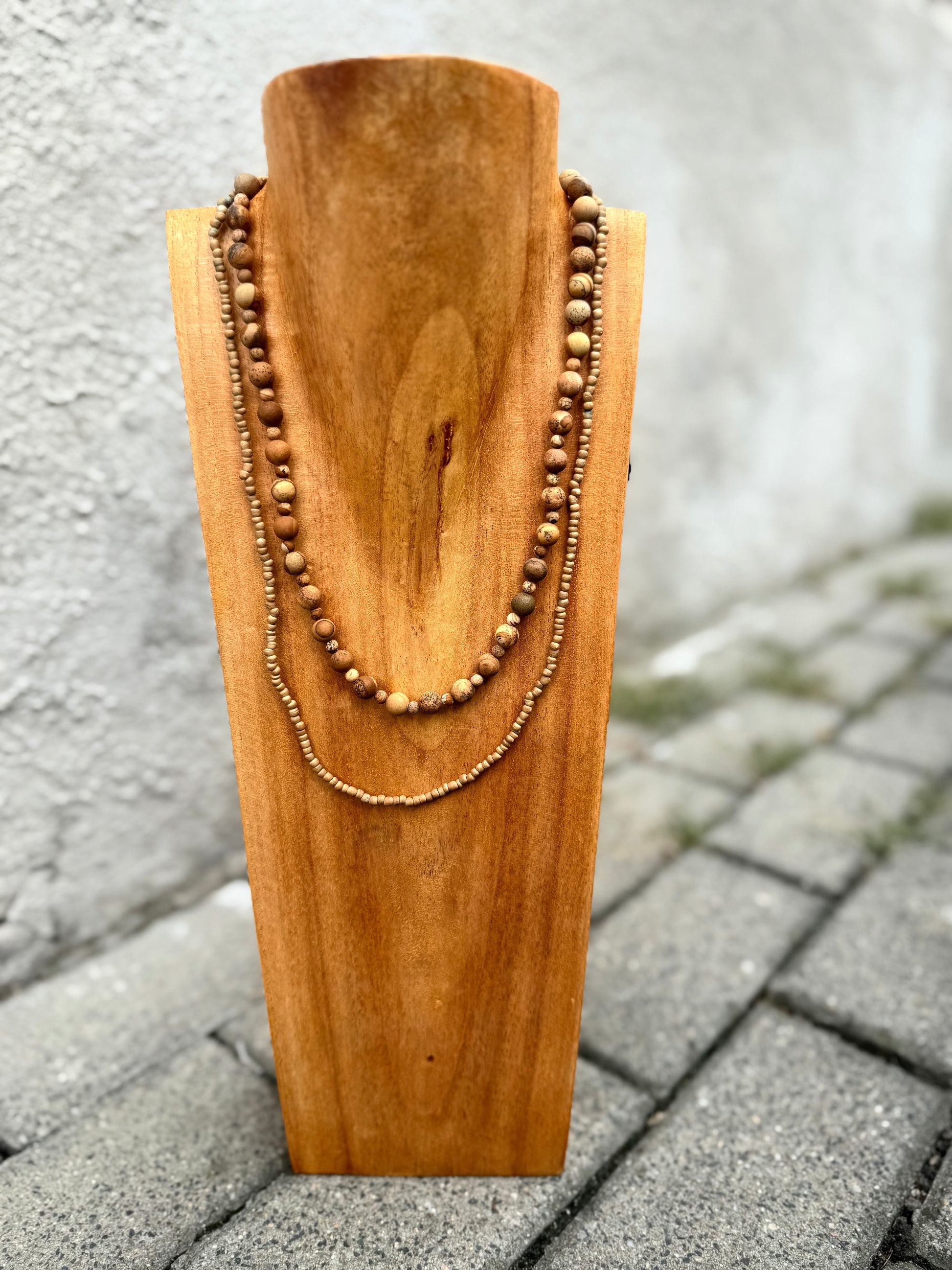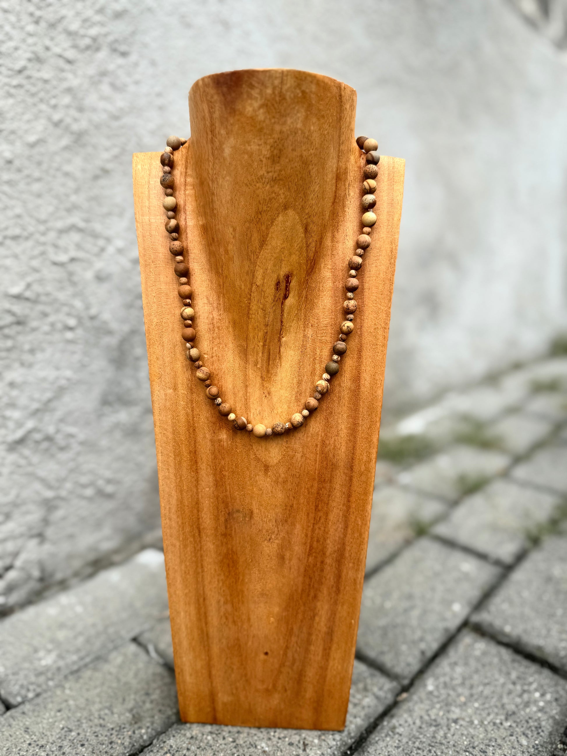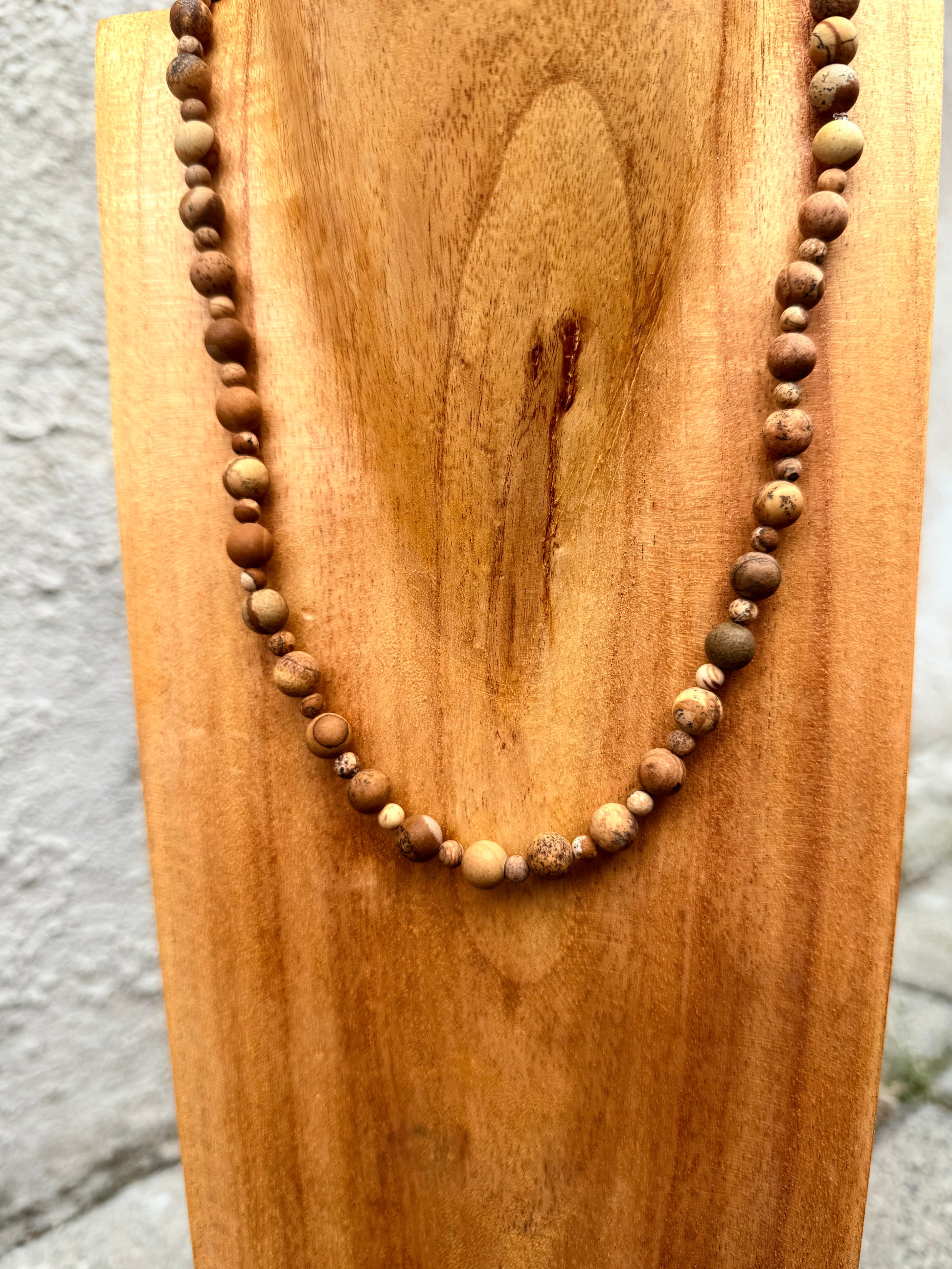 Ten naszyjnik to esencja natury i spokoju. Wykonany z gładkich lub fasetowanych kamieni brązowego jaspisu, łączy w sobie elegancję z głębokim, ziemistym charakterem. Jest to idealny wybór dla tych, którzy cenią autentyczność i potrzebują elementu, który łączy ich ze stabilnością świata.