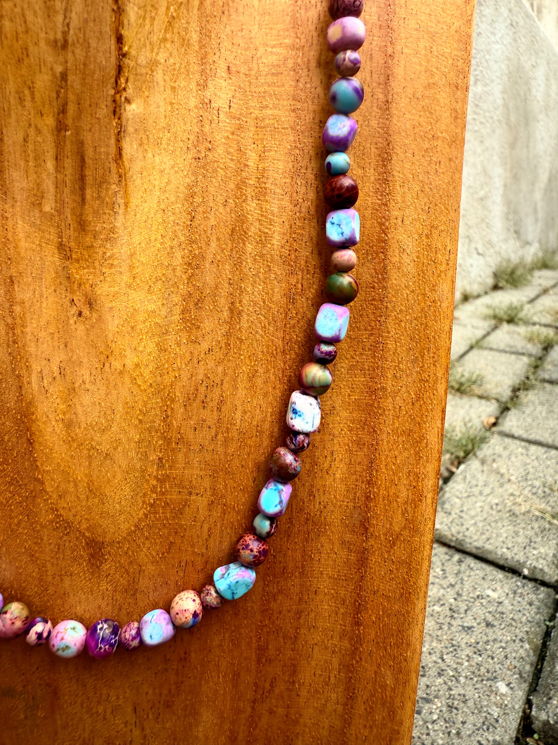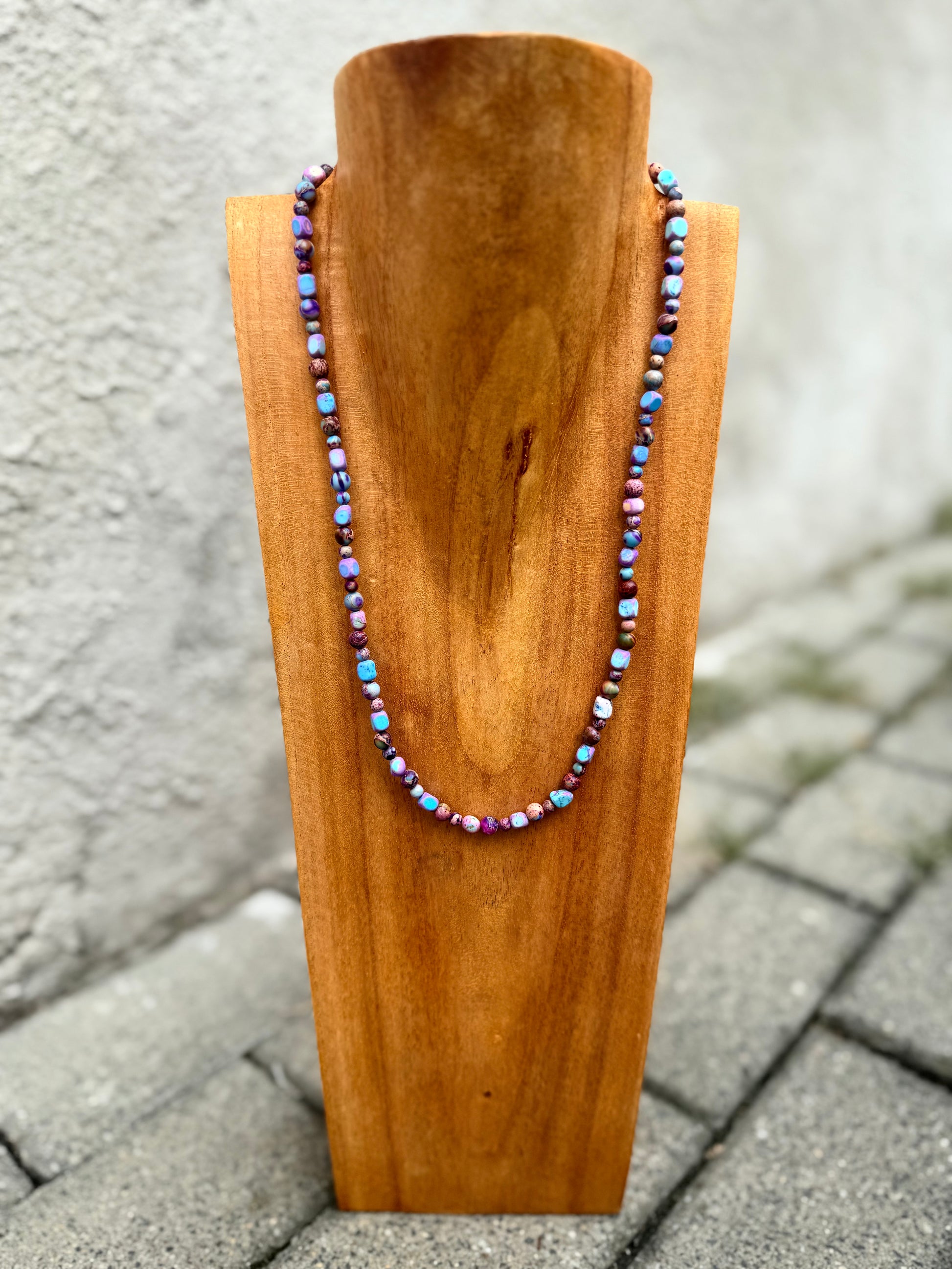Fioletowy jaspis urzeka swoimi złożonymi barwami. Odcienie wahają się od delikatnej lawendy i jasnego lila po głęboki, niemal purpurowy fiolet, często poprzecinane naturalnymi, białymi, szarymi lub czarnymi żyłkami. Ta niejednorodna struktura sprawia, że każdy kamień jest unikatowy, a naszyjnik staje się niepowtarzalny.