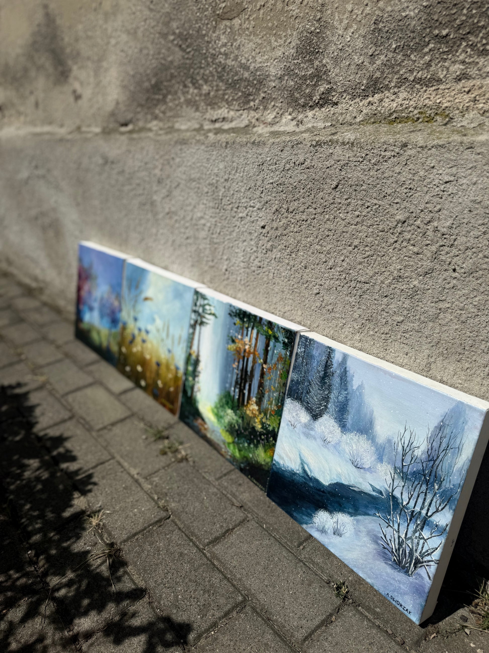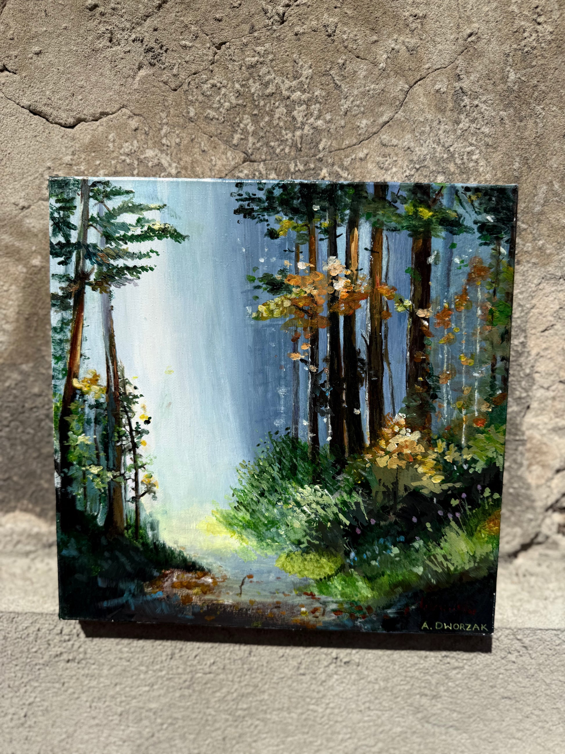 Obraz przenosi nas do wnętrza lasu, w którym panuje atmosfera przejściowego momentu między bujnym latem a nadchodzącą jesienią. Kompozycja jest pełna subtelnych sygnałów zmieniających się pór roku, malowana w palecie barw, która łączy soczystą zieleń z pierwszymi, ciepłymi akcentami jesieni.