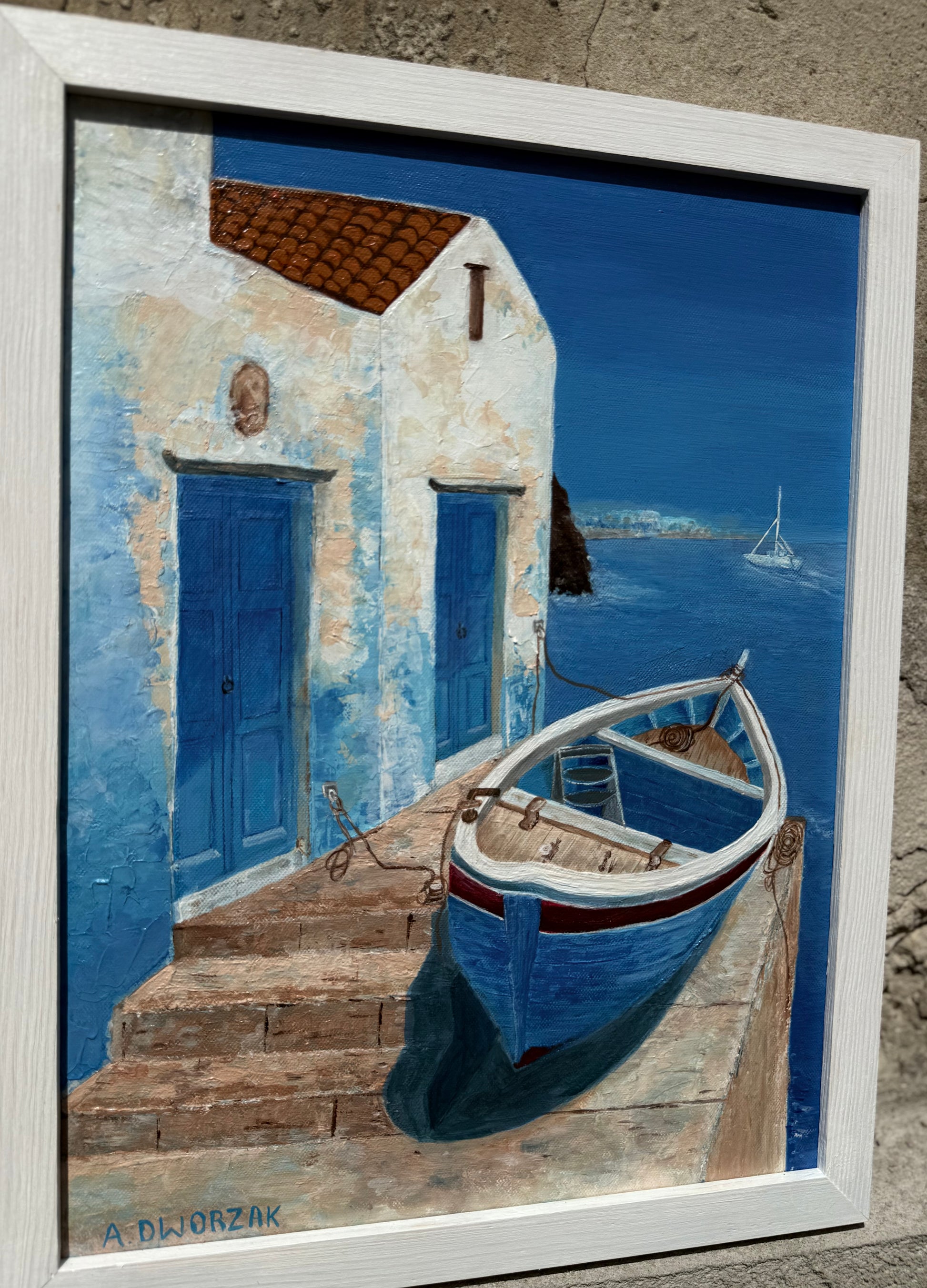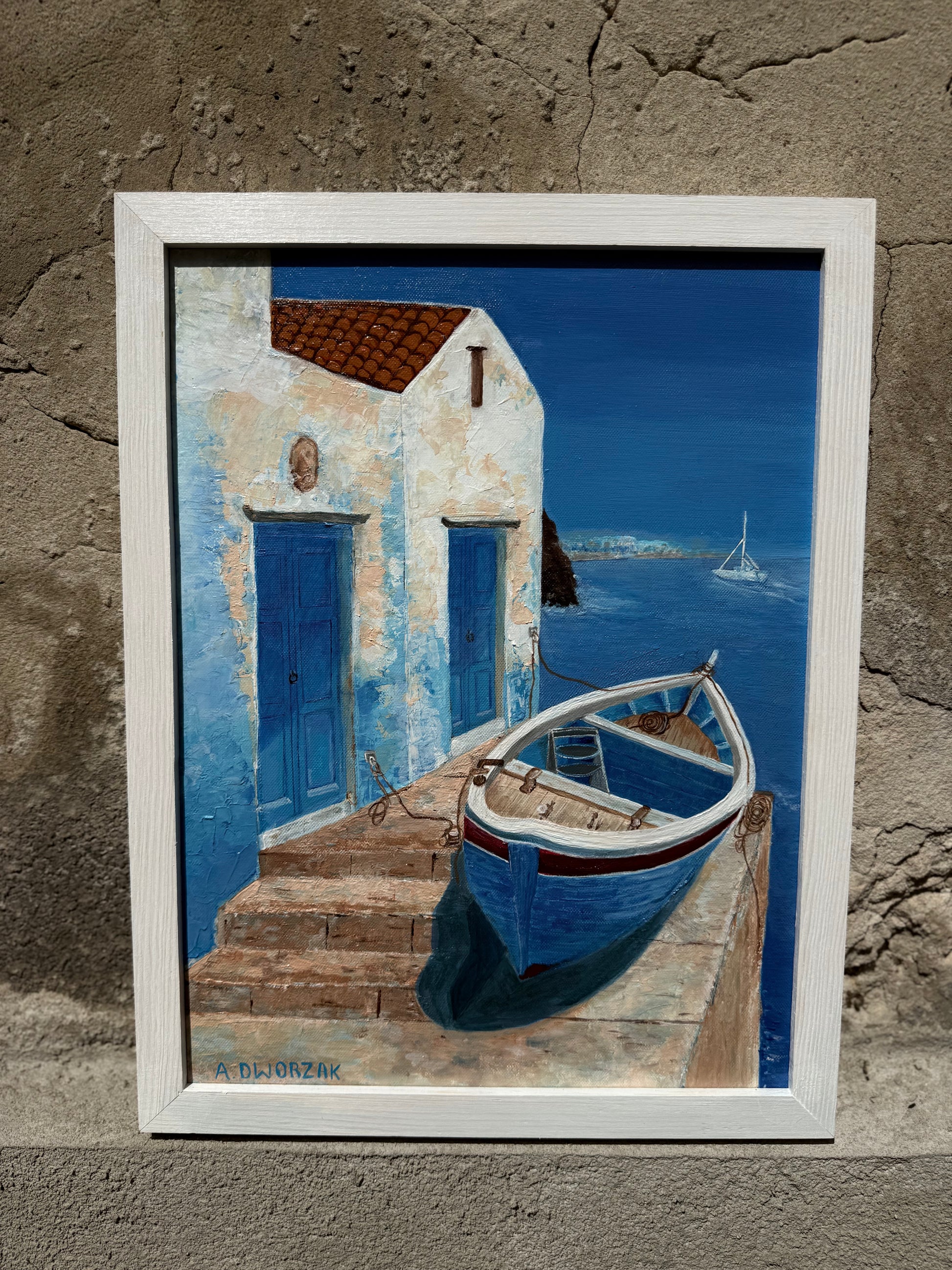 Kolorystyka obrazu utrzymana jest w palecie barw, która natychmiast przywodzi na myśl greckie wybrzeże – intensywne biele, głęboki błękit i ciepłe, słoneczne odcienie.