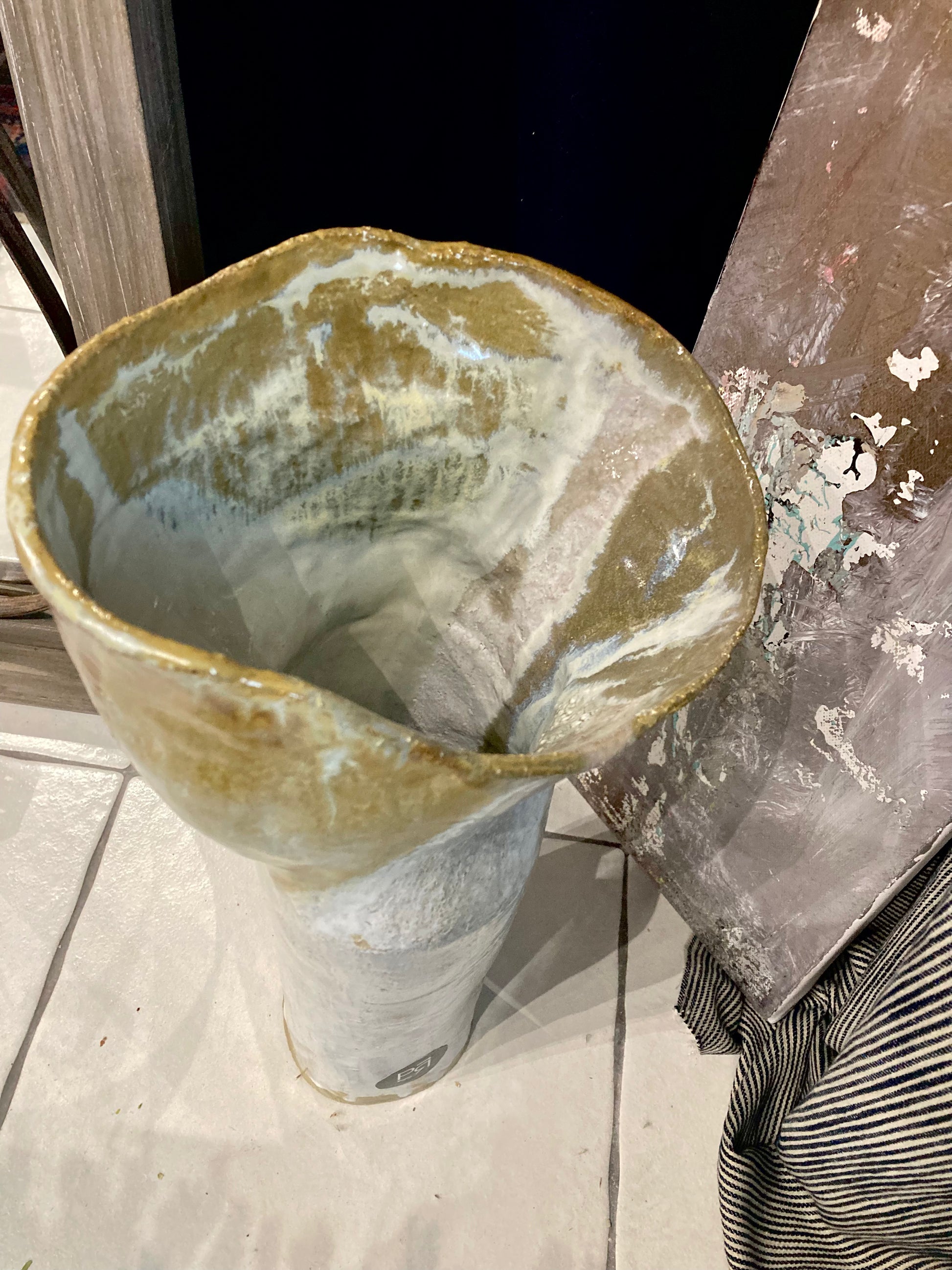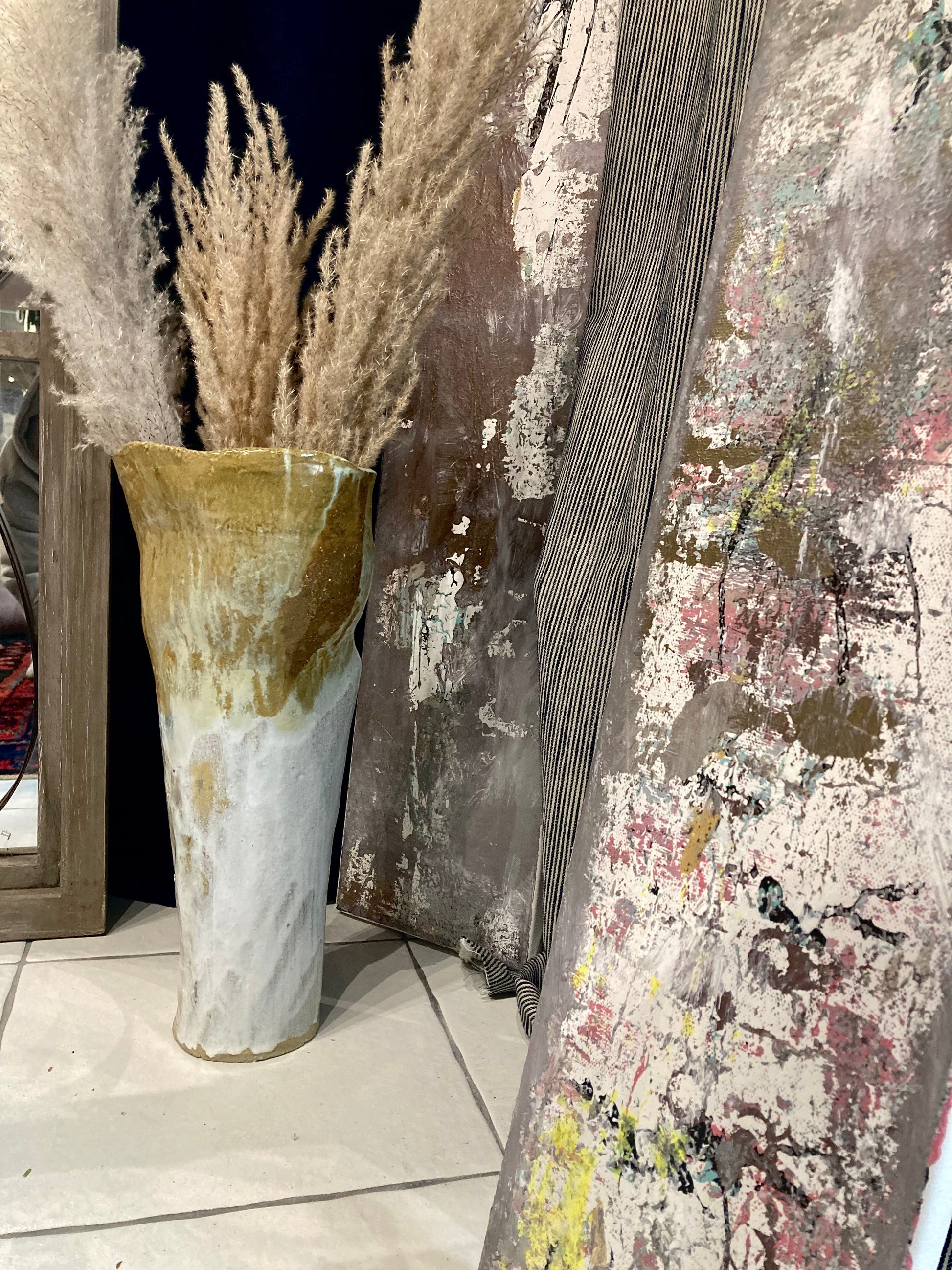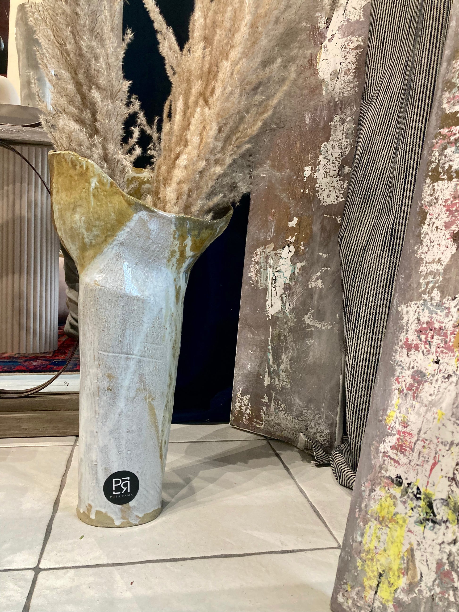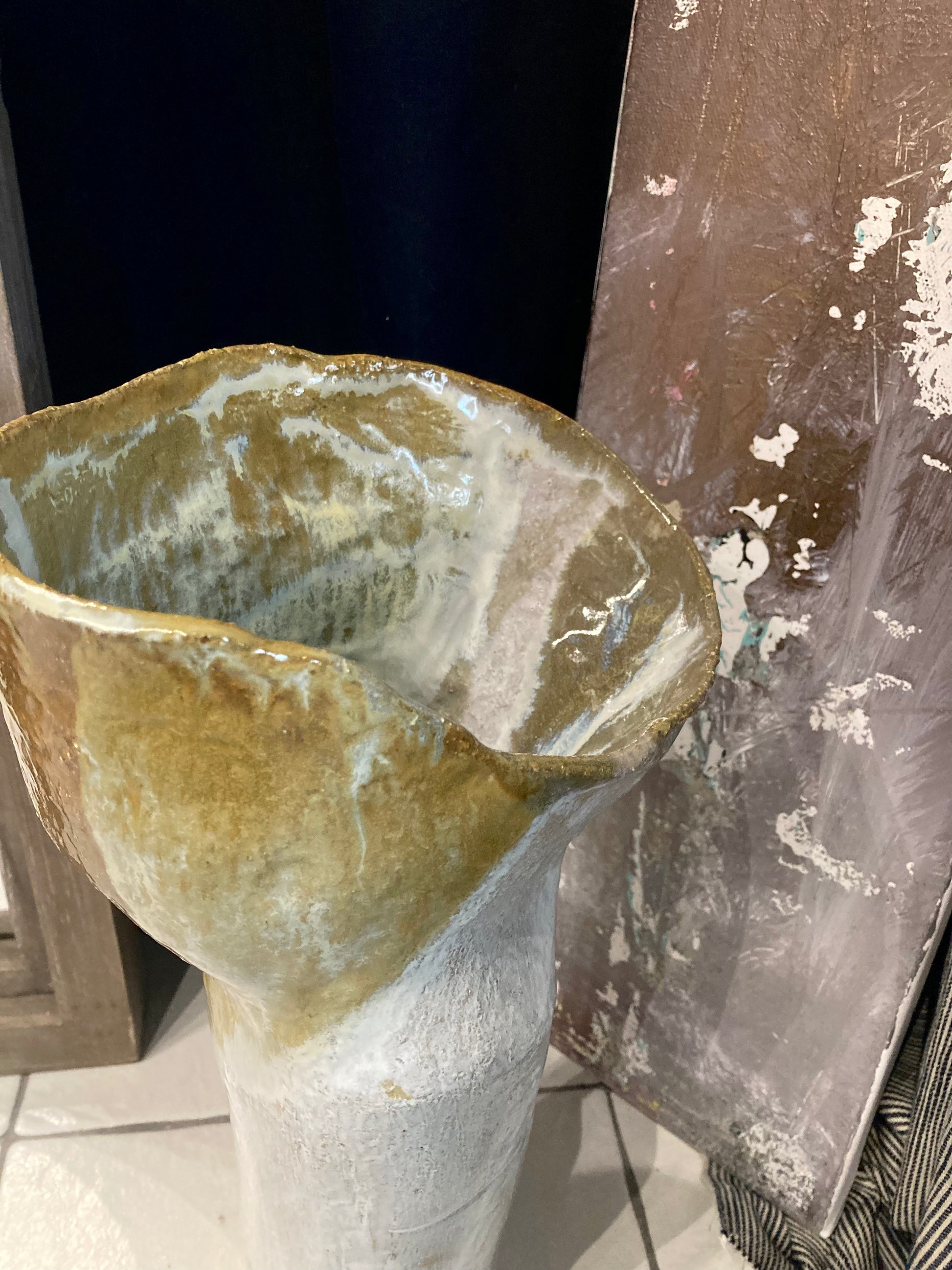 Wazon stworzony z szarej gliny, zachwyca naturalną paletą barw szkliwa, które delikatnie podkreślają jego unikalny charakter. Każdy niuans kolorystyczny i subtelna zmiana odcienia są wynikiem procesu szkliwienia, czyniąc każdy egzemplarz niepowtarzalnym. Jego oryginalny kształt przyciąga wzrok i dodaje nowoczesnego akcentu każdemu wnętrzu.