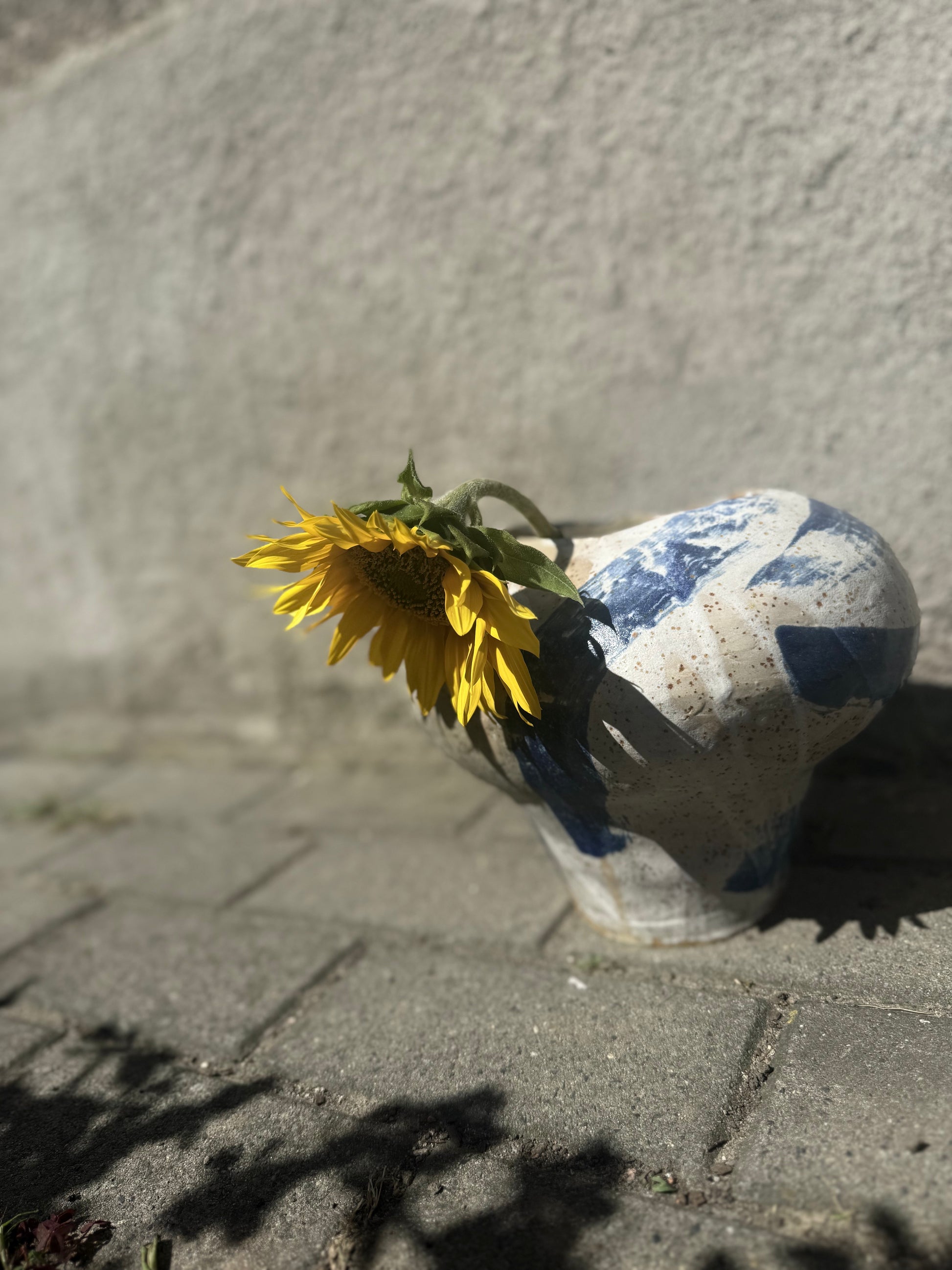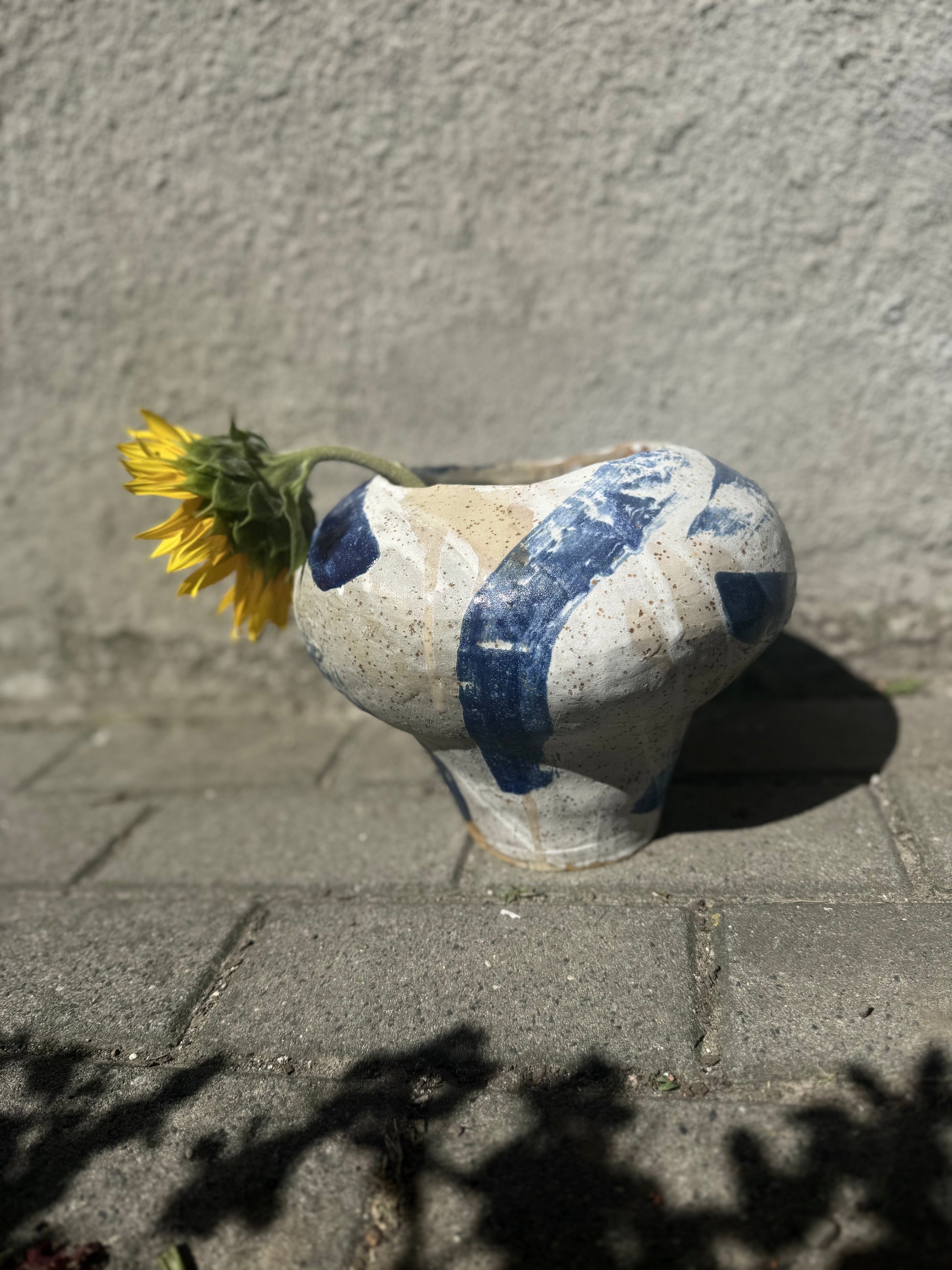 Powierzchnię wazonu pokrywa szkliwo, w którym dominuje kontrastowe połączenie głębokiego, kobaltowego błękitu i matowej bieli. Te kolory nie łączą się w jednolitą masę, lecz tworzą dynamiczny wzór dzięki wyraźnym pociągnięciom pędzla. Widać w nich rękę artysty – ślady, które dodają wazonowi autentyczności i indywidualnego charakteru.