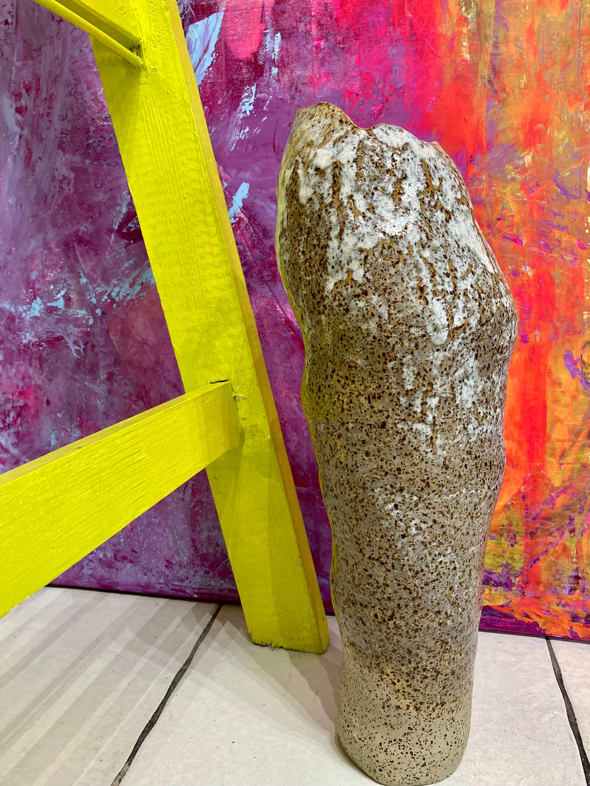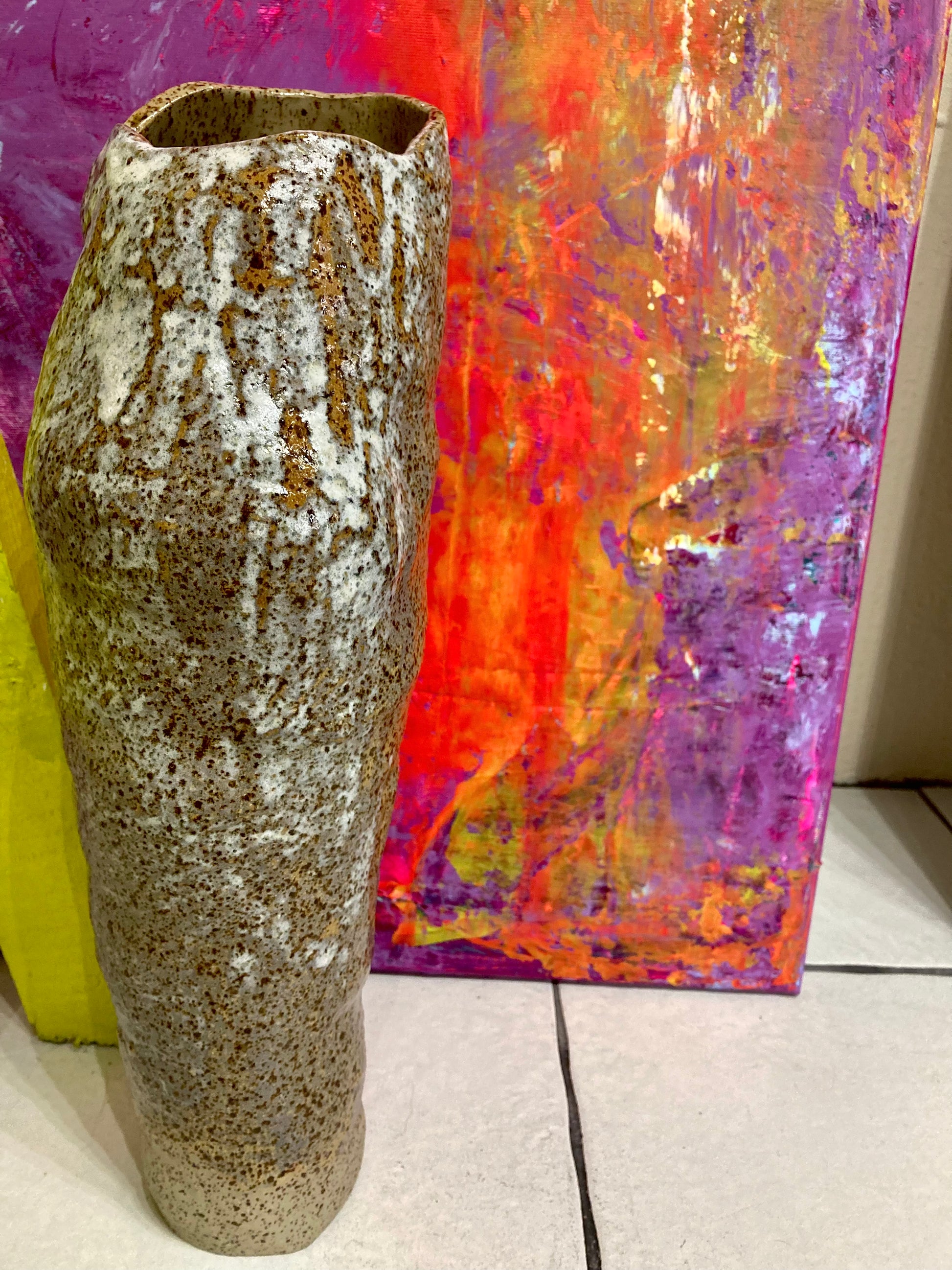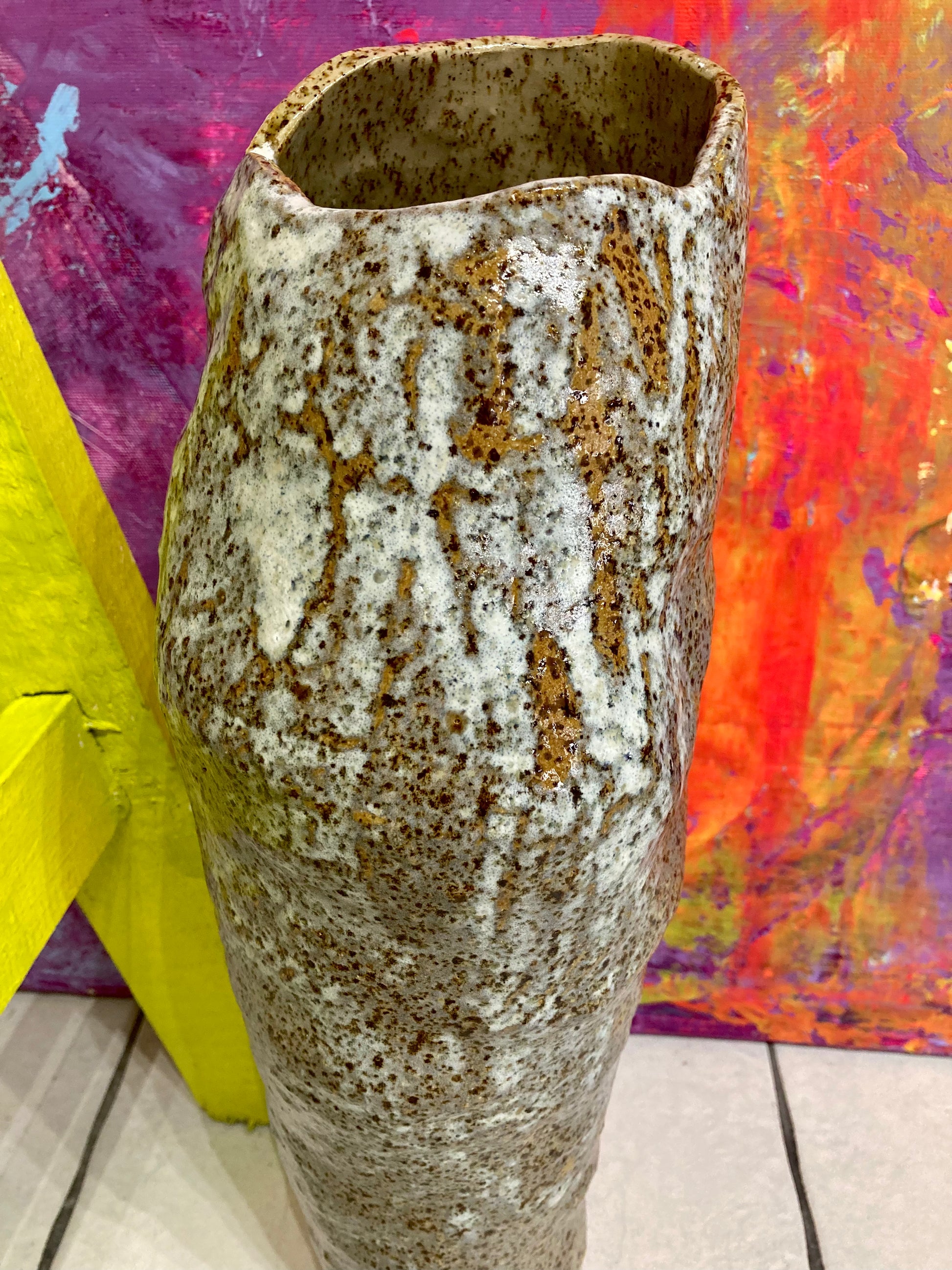 Wazon ręcznie wykonany z nakrapianej gliny. Organiczna forma i subtelna faktura są świadectwem pracy ludzkich rąk, a każdy dotyk przypomina o unikalnym charakterze tego przedmiotu. To ceramiczne dzieło nie tylko zachwyca wyglądem, ale jest również w pełni użytkowe. Jego wnętrze z radością ugości Twoje ulubione bukiety, stając się niebanalną ozdobą każdego wnętrza.