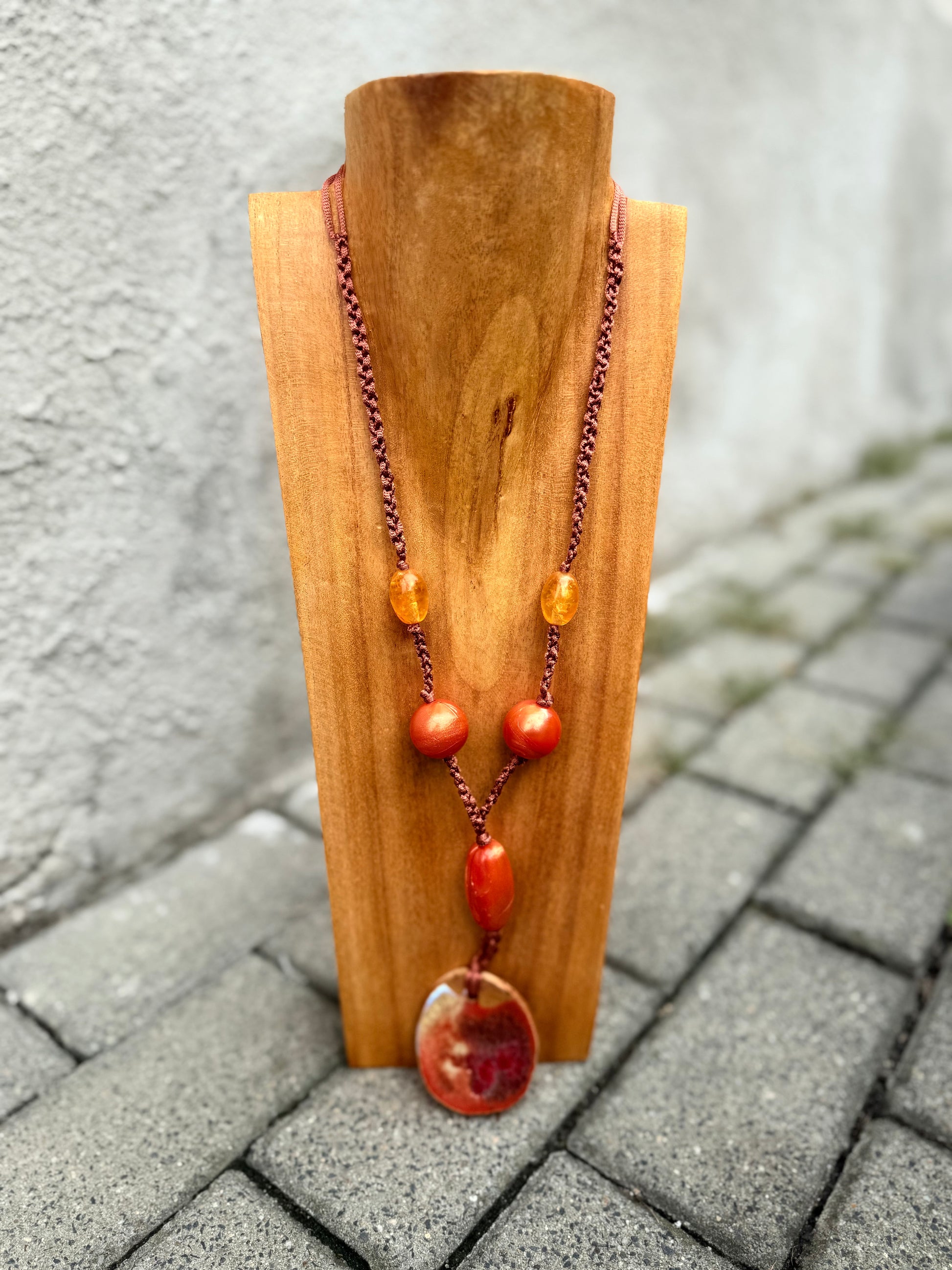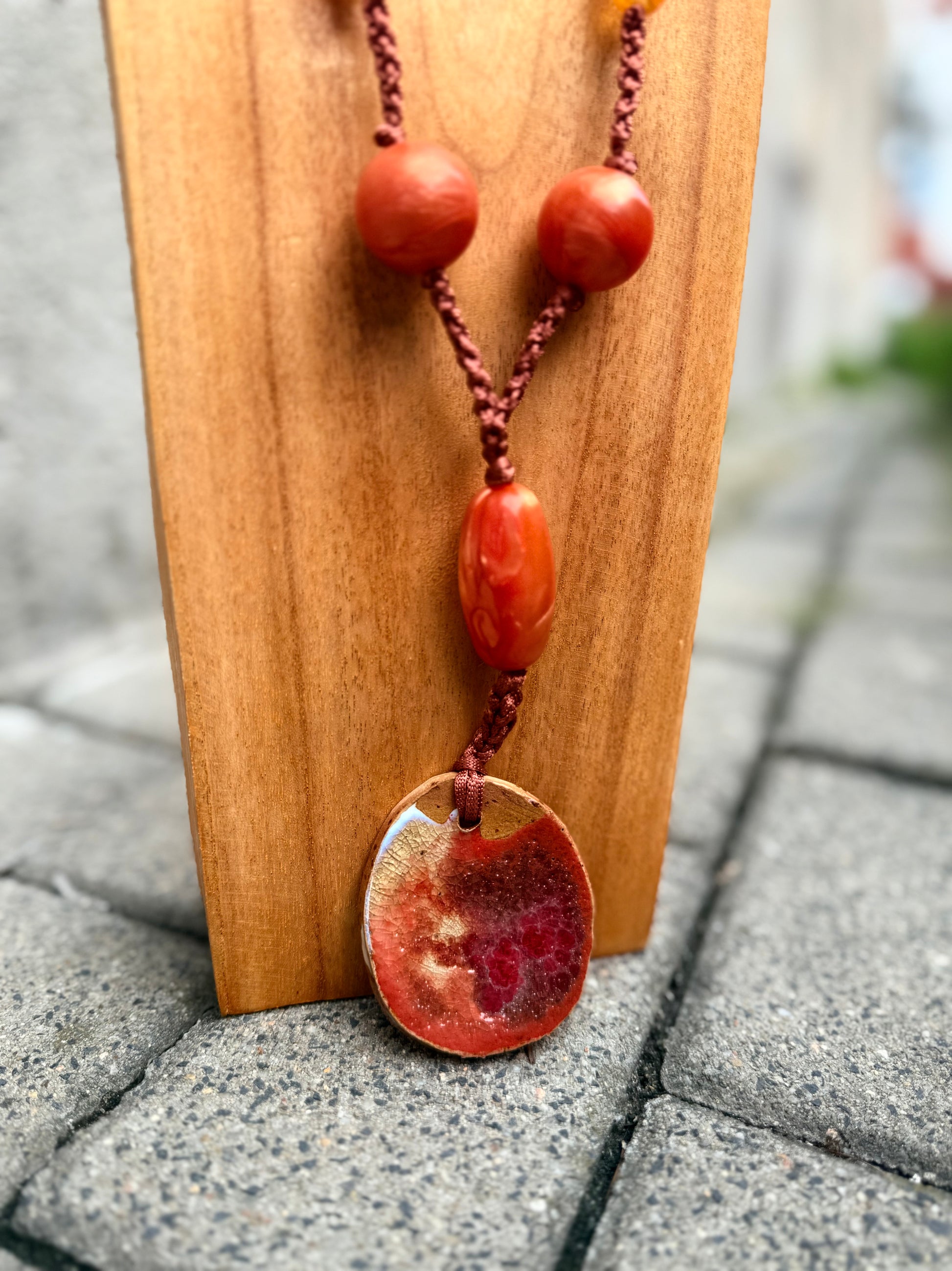 Ten wisior to esencja rzemiosła i koloru. Stworzony dla osób, które nie boją się wyrazistych dodatków, łączy ciepło ceramiki z gładkością satyny, tworząc biżuterię z charakterem.